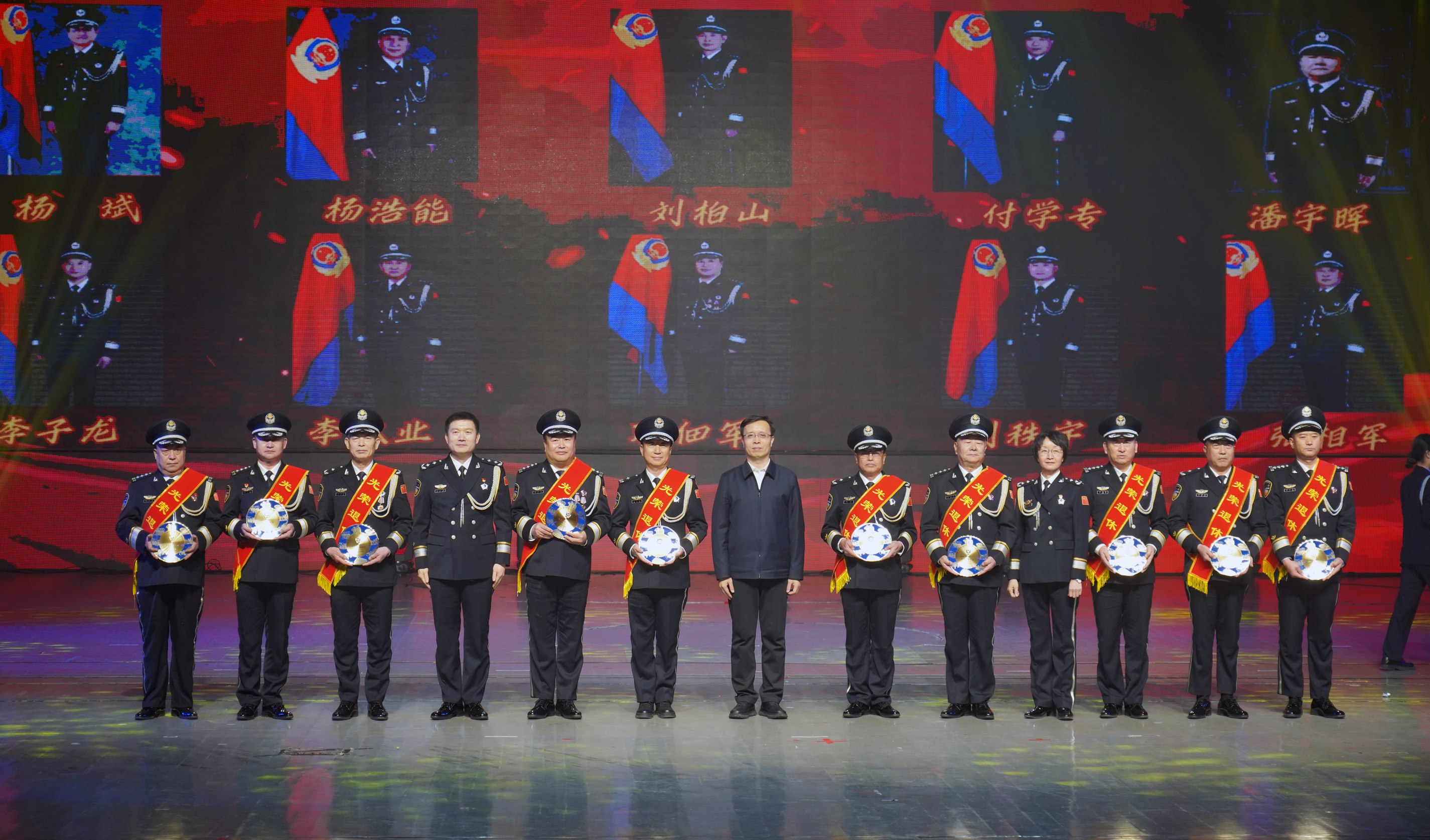 市委常委、政法委書記李曉波,省公安廳二級巡視員賈永華,市政府副市長、市公安局黨委書記、局長康海潮為退休民警頒發(fā)退休紀念盤