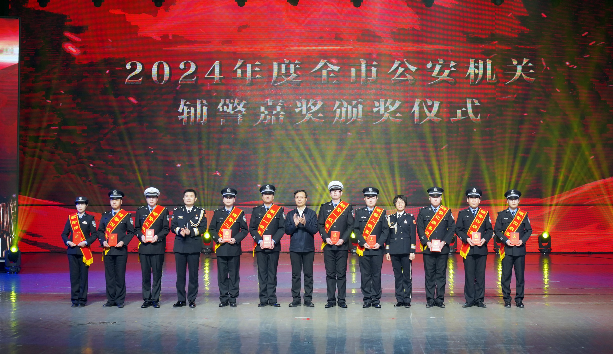 市委常委、政法委書記李曉波,省公安廳二級巡視員賈永華,市政府副市長、市公安局黨委書記、局長康海潮為輔警嘉獎代表頒獎