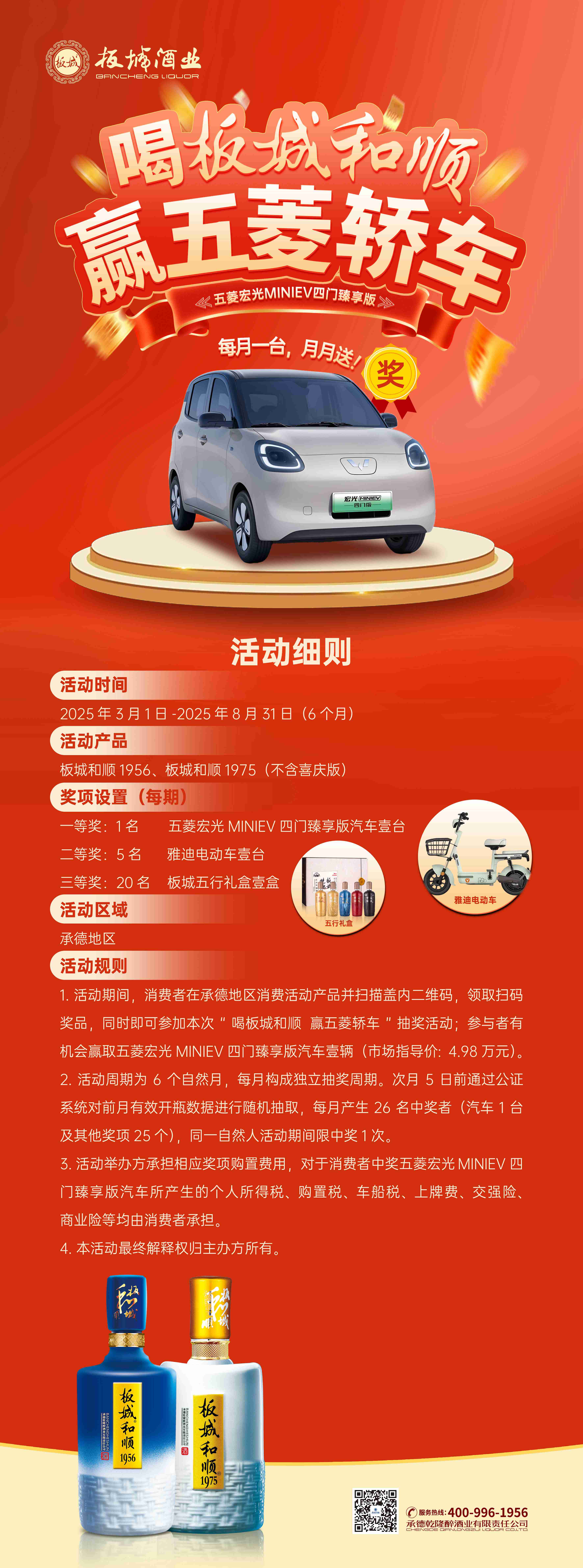 消費者在承德區(qū)域購買板城和順1975、板城和順1956(不含喜慶版)產品后,掃描瓶蓋內二維碼,即可自動參與抽獎。掃碼用戶除享受原有掃碼獎勵外,還可額外獲得贏取五菱宏光MINIEV四門臻享版汽車、雅迪電動車等重磅獎品的機會。